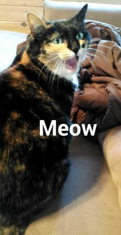 Alley is a female Calico cat, black, white & orange.