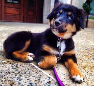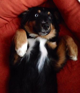 Last seen on Saturday November 30, 2013 at 5 month old black tri color Australian Shepherd. She weighs 26.2 pounds, has blue eyes (the left is half brown and blue), some white blazing on chest, was wearing a pinch training collar and a regular flat collar with heart designs. My son accidentally clipped the leash onto her ID tag split ring instead of the pinch. She's extremely friendly and well mannered. Her legs are mostly brown with touches of white, as if she walked thru wet paint. Her anal brown patch looks like an outline of a Chicago Bull's emblem. She is not microchipped because the vet wanted us to wait until she was spayed to do it. Thank you!