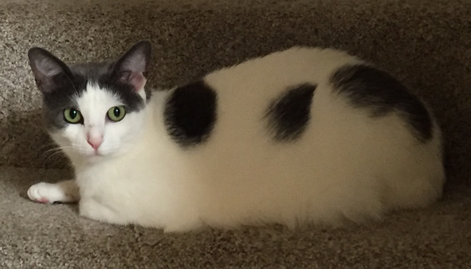 Last seen on Saturday October 8, 2016 at Southborough, MA. Bacon is a female domestic short-haired cat who is about 9lbs and is white with grey/black spots (like a cow). She is usually an indoor cat and is very skittish. Microchip #0A13733F6B. Thank you!