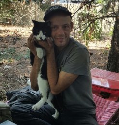 Last seen on Saturday August 26, 2017 at South Boston Seaport area, MA. Beast is a male black and white cat belonging to the homeless man pictured here. Beast is chipped and may have on a blue harness. Lost behind the venting stacks at the entrance for the Ted Williams tunnel and the Mass Pike, somewhere around Congress St. and the Mass Port haul road. Thank you!