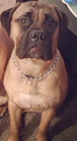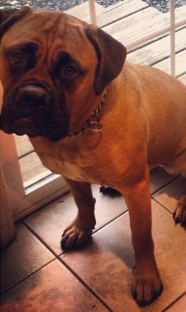 Bella is a red fawn black mask bullmastiff, 100lbs.
