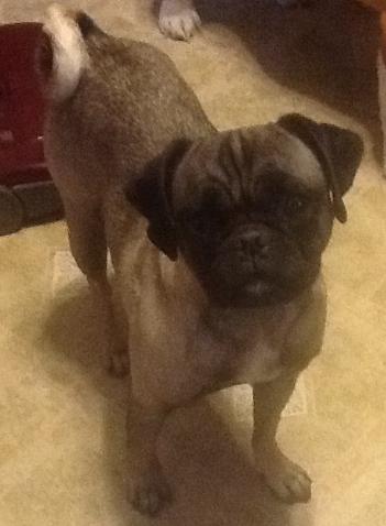 Bella is a 2 year old silver pug w/a black mask. She was coming to her new home @8am this morning,[7/15/13] broke from her harness and ran. She is silver w/a black mask, about 15-20 lbs.