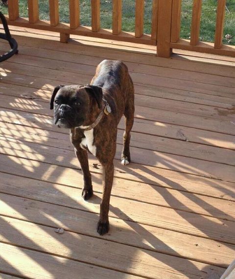 He has no collar or tags on him. He is a brindle boxer (black with brown markings & white chest). He is very friendly.A