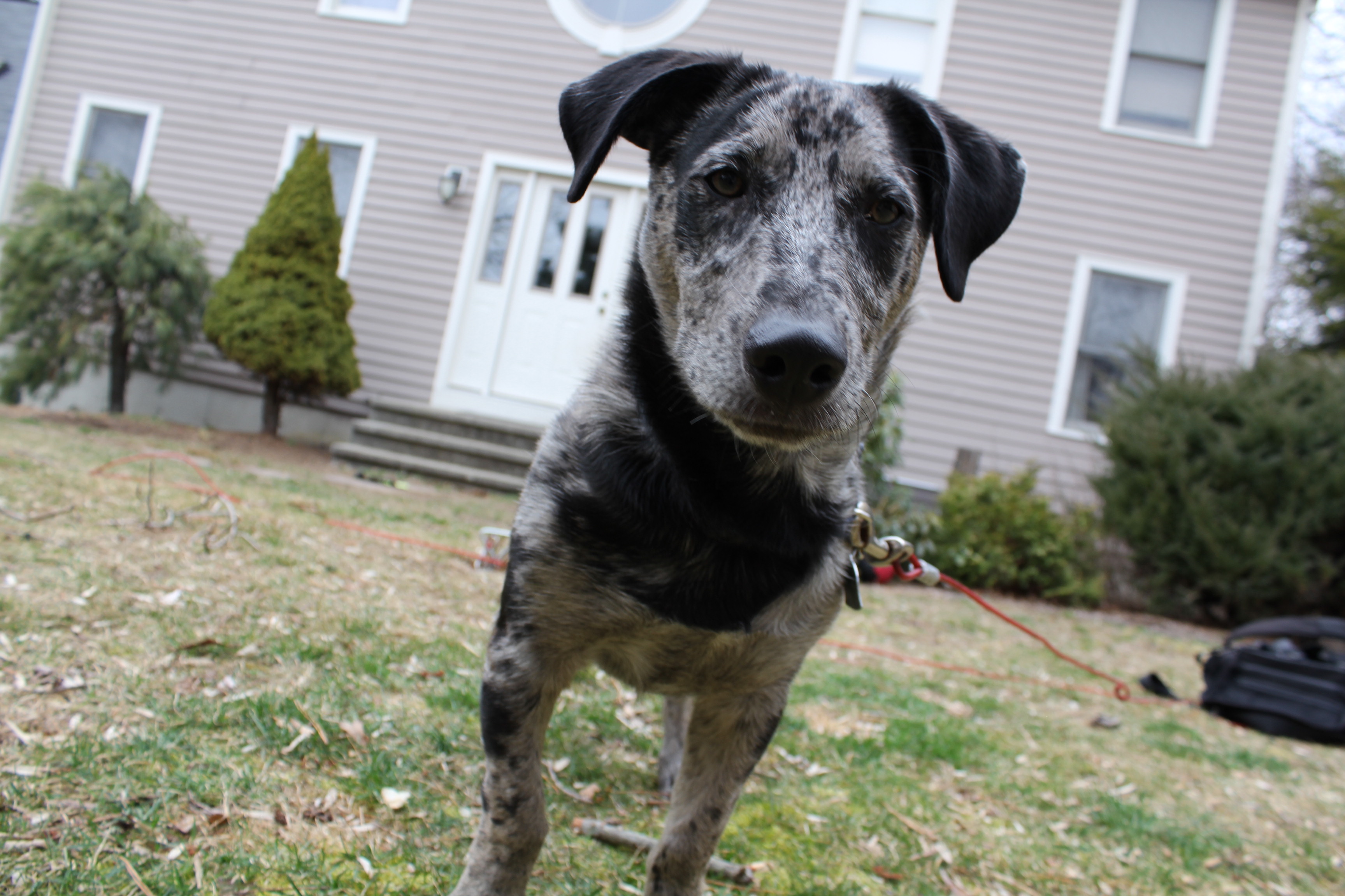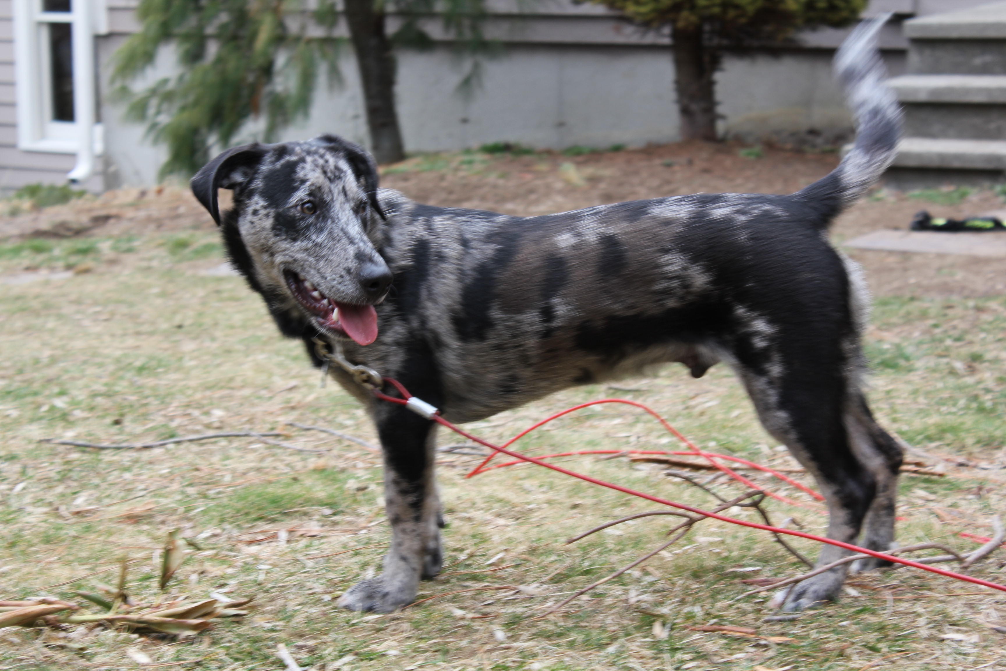 He answers to Brigham or Briggy or Briggy Bru, has distinct blackish gray markings, and some brown. He has a blue collar with bones on it. He is approximately 45 lbs and very friendly.