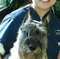 Brooke is a grey standard Schnauzer with purple harness and leash.
