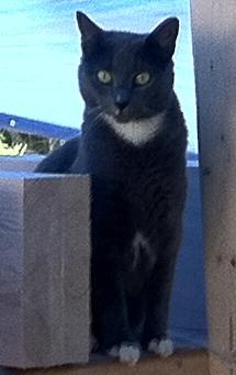 Cali is gray with a little white on her nose, chin, and neck. She has a white bib and a little white on her chest. All 4 feet are white. She is quiet and somewhat shy.