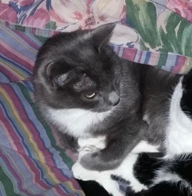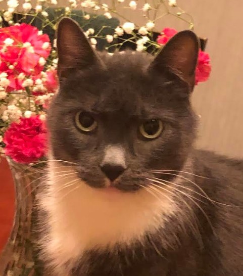 Cookie is a grey and white male cat. Microchip #OA125F497D.