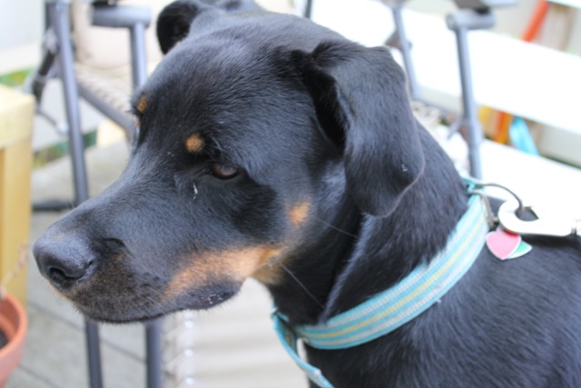 Female, about 50lbs. Found with blue collar and rabies tag. Mostly black with brown paws.