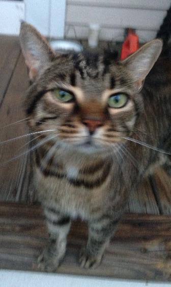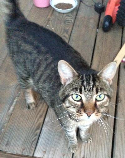 Found on Sunday, July 21, 2013 at Bridge Rd., Florence, Northampton, MA. This tiger cat showed up at our house and has stayed under/on our porch ever since. Fairly large, looks like a Maine coon cat but with short hair. Appears to be in good condition, very friendly, a real sweetie -- has obviously been loved/cared for. If you think you recognize this animal, please call 413-586-4657 or email mlaro92183@gmail.com Thank you!