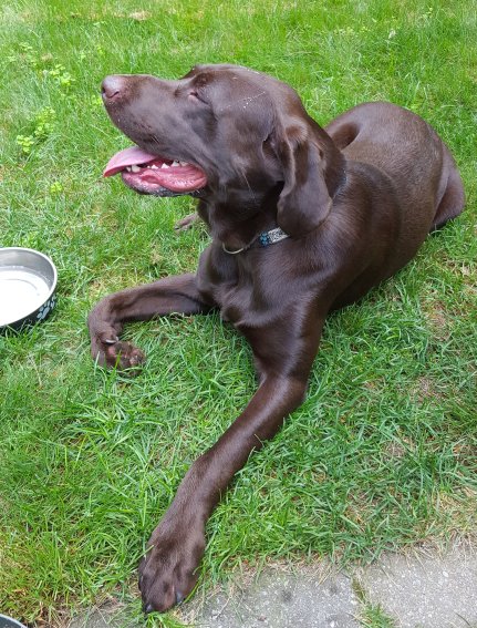 Large chocolate lab. He has a collar, but no tags. He is now at Acton Animal Control.