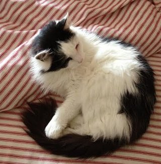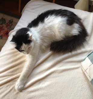Jo Jo is a black and white male cat, thin with long legs and tail.