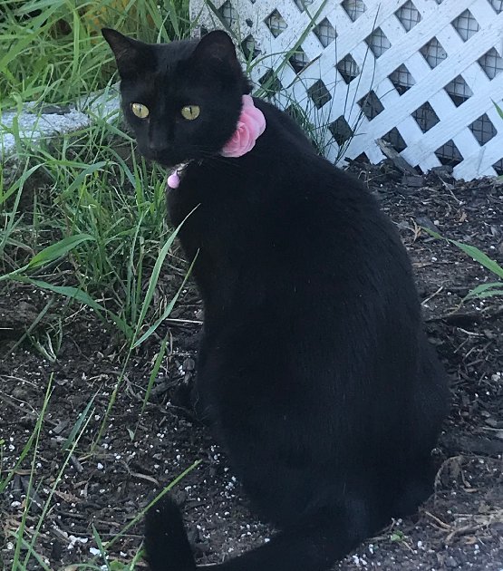 Last seen on Saturday September 8, 2018 at Milk St., Methuen, MA. Possible sightings on Magna Rd. and Timber Lane. Jojo is a year-old black spayed female DSH cat with a small white spot on her chest and bigger white spot on her belly. She's really small, timid and shy. Wearing a gray collar with 3 pink roses and a bell. Thank you!