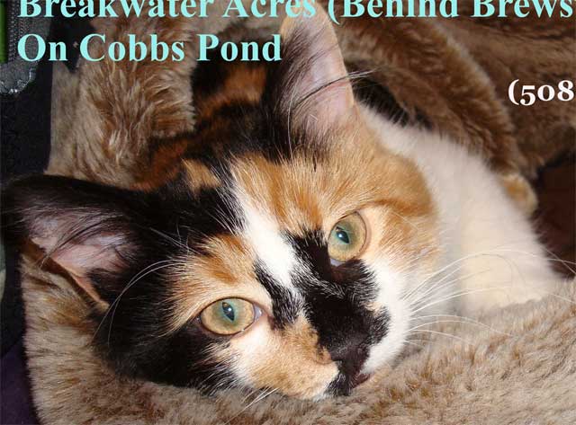 Last seen on Thursday May 15, 2014 at 57 The Channel Way, Brewster, MA. Kato Boo is a female spayed Calico cat. Long Hair, 6 years old, 8-10 lbs, white underbelly, green eyes, multicolored face. Black White and Tan. No white on back I think, or just a little. Was in excellent health when last seen mid May. If you think you've seen this pet, please call 508-846-1397 or email eventsupport@comcast.net Thank you!