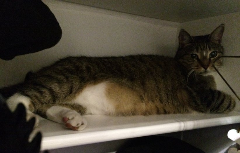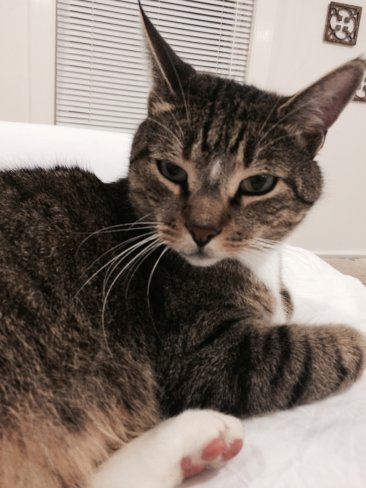 Kato is a male tiger cat, about 8 or 9 years old. He has a missing front incisor.