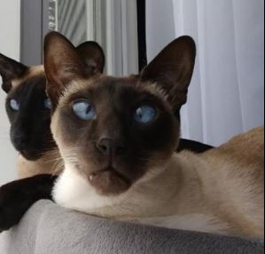 Chocolate point color with crossed blue eyes. Adult 9.5 lbs, neutered.