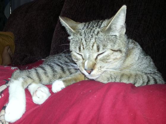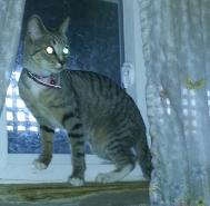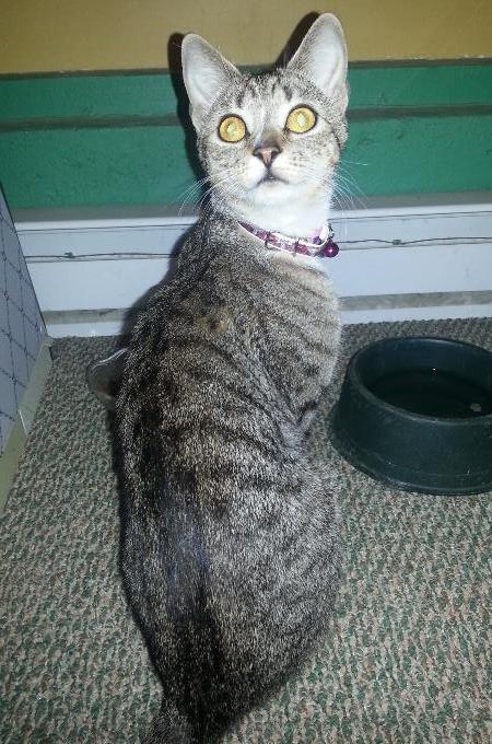 Last seen on Wednesday, June 5, 2013 at School St., Sterling, MA. She is a long sleek tabby with white toes on front and white feet in the back. She has a little white on her neck and a white stripe on her nose. She was wearing a pink scratched she has golden yellow eyes. up collar with a pink bell that used to have glitter on it but most had worn off. Under the collar is her name and my number. She is shy in new situations but friendly. We just want her back asap as we miss her so much. If you think you've seen this animal, please call 508-340-1172 or email katrinaj920@comcast.net. Thank you!