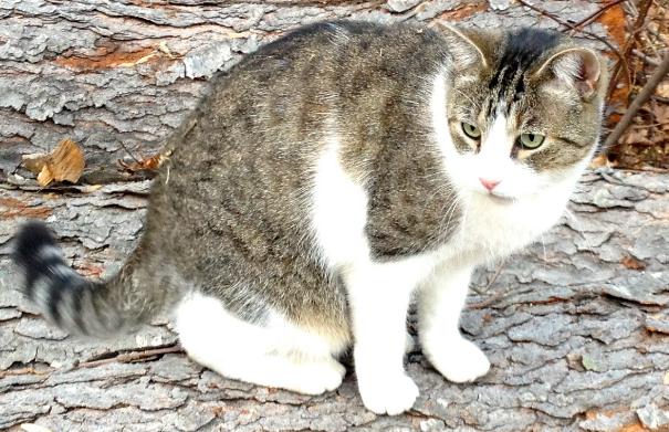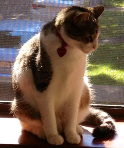 Margaret is a 7-yr-old female domestic short-hair cat - white triangle on face, missing one canine tooth, wears pink collar with tag and bell.