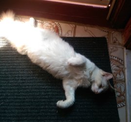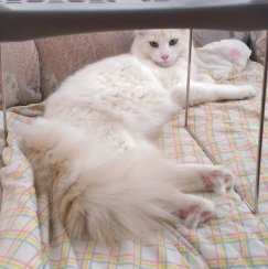 Last seen on Sunday August 31, 2014 at Meatball is a white Turkish angora, 6 month old neutered male, indoor cat. He has white long silky hair, pink nose. Thank you!
