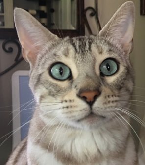 Mein is a 12lb Snow Bengal cat, white and tan with blue eyes.
