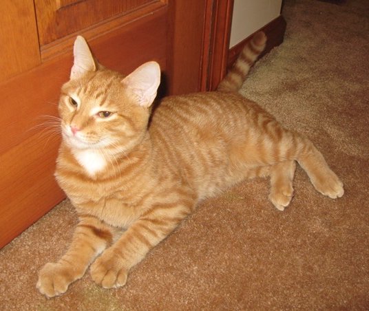 Lost on Tuesday August 12th, 2014, last seen on Wednesday 13th at Mendon is an orange tiger with a long tail. He is an indoor cat and does not carry identification. He was last seen on Wednesday, August 13th. He fell from a second story window when the screen broke, so he may have injuries, but didn't appear to have any when he was last seen on Wednesday. He is skittish and runs from people, and ran from us during the heavy rain possibly because he was likely traumatized from the experience. Thank you!