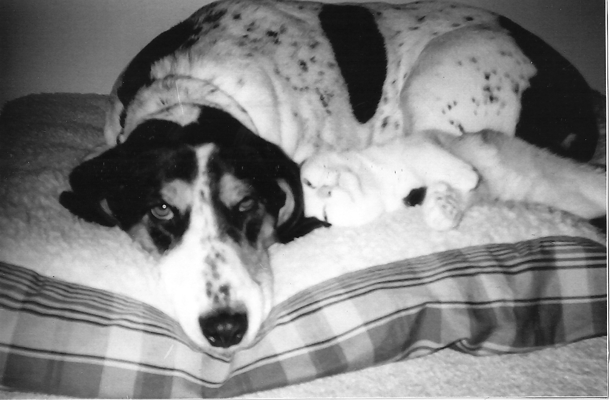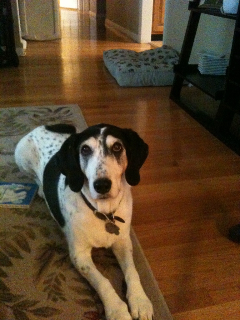 She is mostly white with large black spots, has a long snout, weighs around 60lbs and whines a lot when happy.