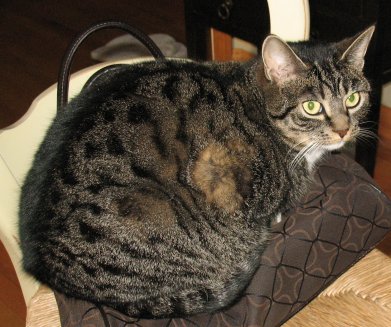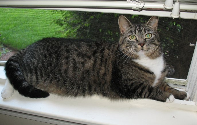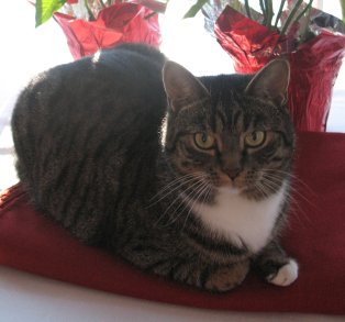 Moose (or "Moosey") is a 5-year-old female gray tabby with white paws, chest & belly. She weighs around 11-12 pounds. She normally loves to purr and go in boxes, but does not like laps or to be held.