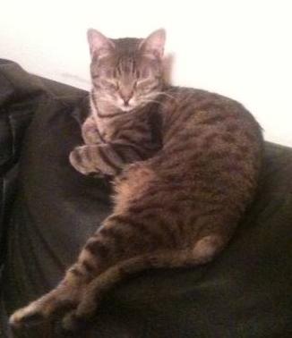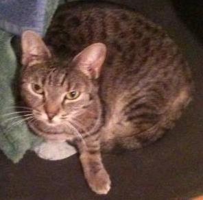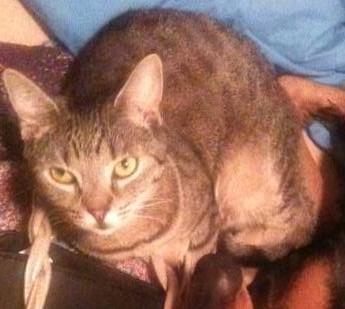 Last seen on Monday November 18, 2013 at Nahla is a shorthaired gray tabby with a dark/black streak down her back. The tip of her tail is also black. She has yellowish eyes and is quite vocal, opening her whole mouth when she meows. Nahla is immunocompromised and may have ulcers around and/or in the mouth area. Thank you!