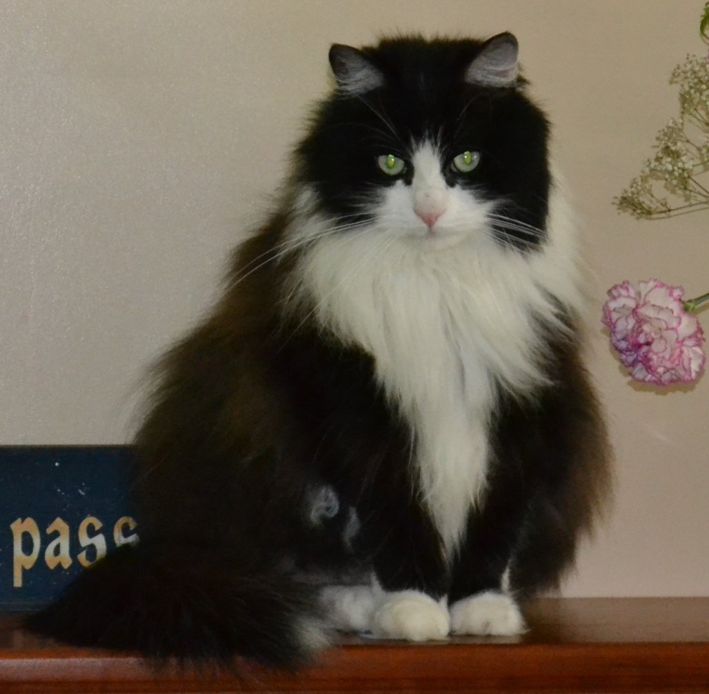 Petyr is a black and white "tuxedo" cat with long hair. Thank you!