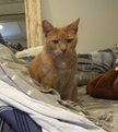 "Pig" is a longhaired male orange cat with yellow eyes and huge double paws in front. Small white patch on chest. Super friendly and sweet.