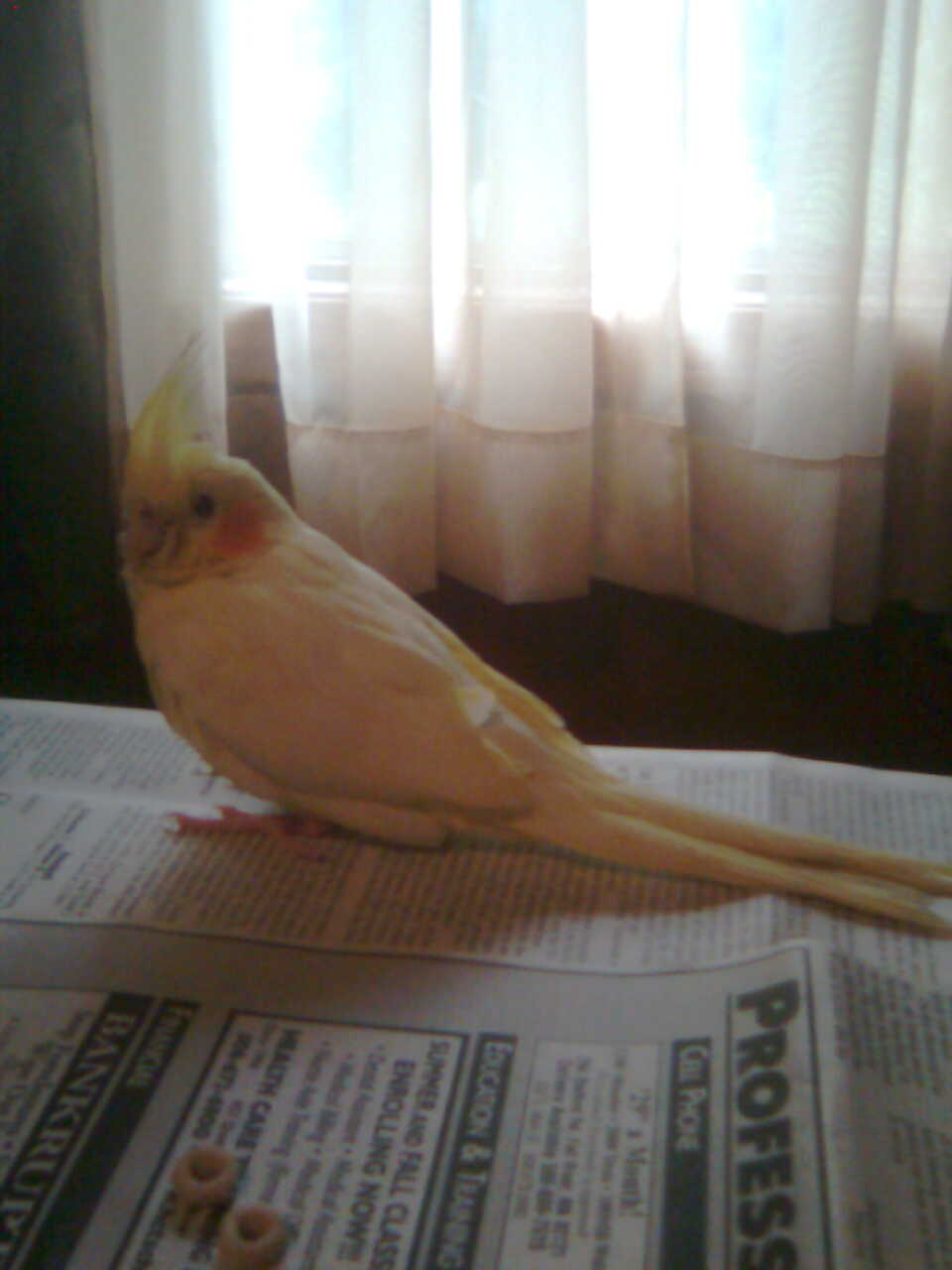 A yellow, Lutino Cockatiel named Puck has been missing from his home since Sunday, May 27, 2012 at 8 P.M. Puck is 1 yr. 3 months old, knows the "Up" command (to get him on your finger or perch) and is able to wolf whistle. He will be skittish around new people but is hand-tamed. If found please contact me at: Tren74@aol.com. Thank you.