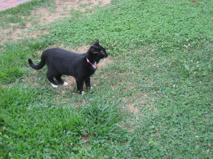 Small black cat with white paws, yellow eyes, white stripe on chest, no collar.