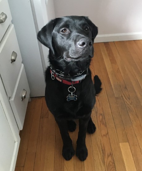 Toby is a 5-year-old black male labrador retriever weighing 95lb. He was wearing a blue collar with his name on it.